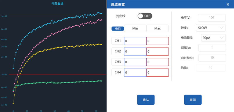 可在設(shè)置界面輸入閾值判定上下限,選擇開(kāi)啟判定線功能后,將在圖表中顯示。方便用戶直觀的了解當(dāng)前測(cè)試結(jié)果的范圍。