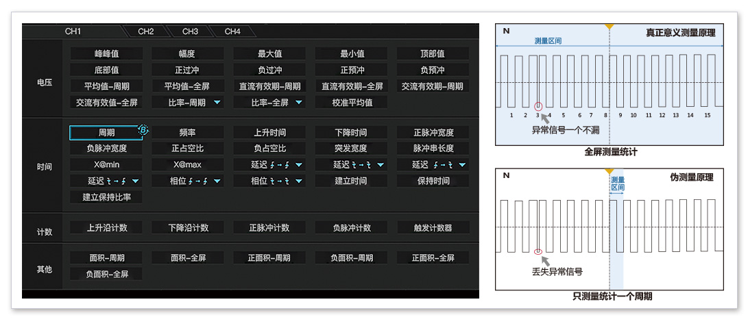 不同于傳統(tǒng)示波器只測一個周期,或通過抽樣減少數(shù)據(jù)量再測量的模式,ZDS1104示波器通過FPGA全硬件并行處理,基于原始采樣率和28Mpts全存儲深度,對每一幀波形每一周期進行測量統(tǒng)計,測試項目可達50余種,并且支持8種參數(shù)同時顯示。