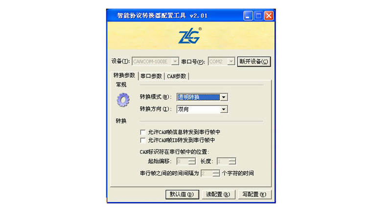 CANCOM-100IE+集成1路3線式RS-232通訊接口,集成1路2線式RS-485通訊接口,集成1路4線式RS-422通訊接口,可通過配置軟件設(shè)定轉(zhuǎn)換器工作方式。通訊速率在600~230400bps之間可設(shè)定;