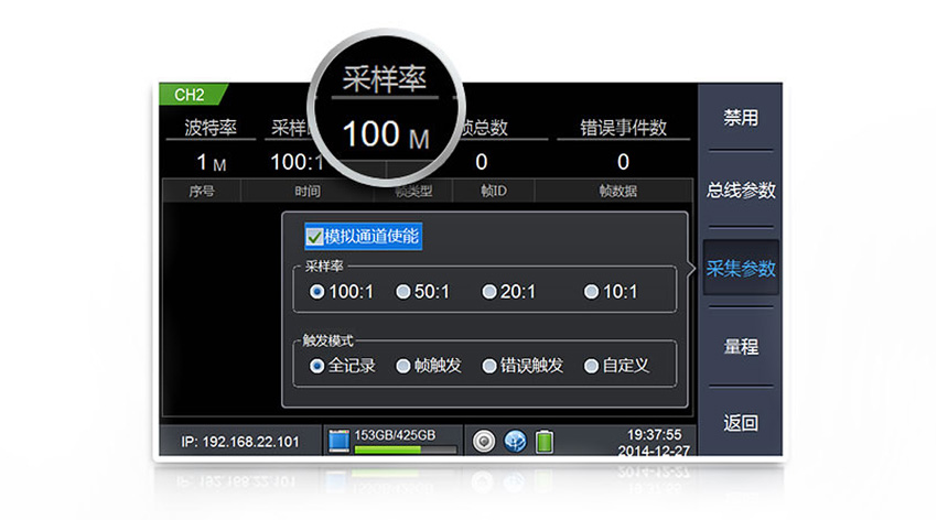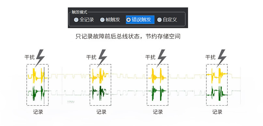 2通道CAN模擬與數(shù)字信號混合記錄通道(可同步存儲CAN報文與對應(yīng)波形,采樣率100MSa/s);