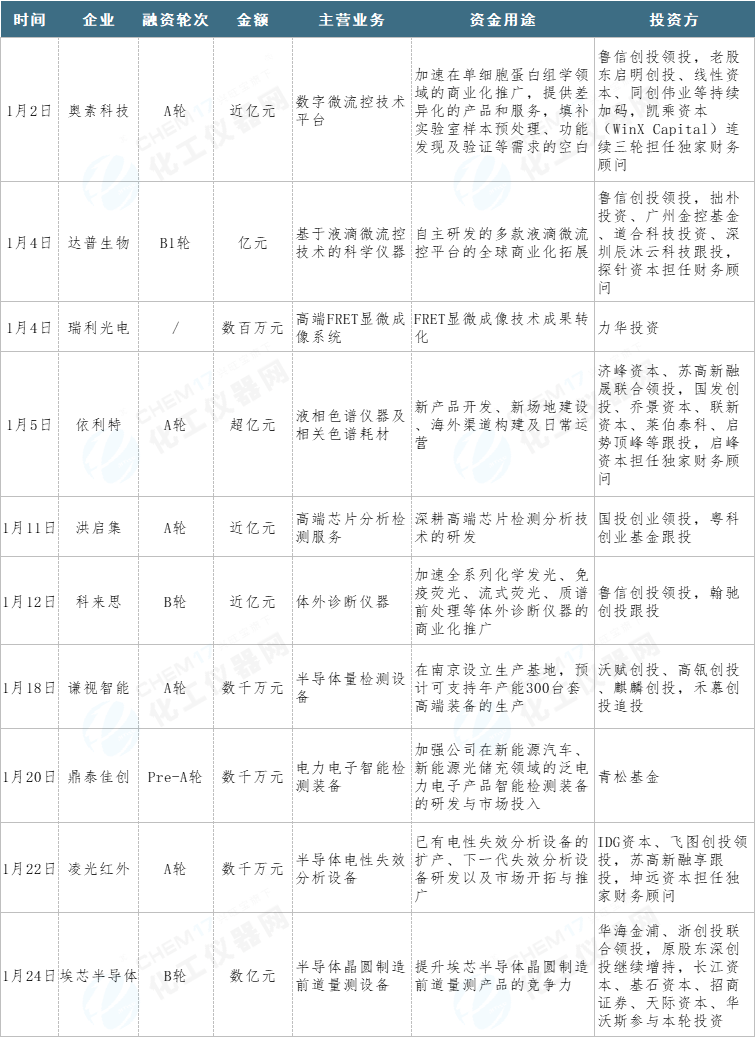 據(jù)化工儀器網(wǎng)不完全統(tǒng)計(jì),1月國內(nèi)儀器行業(yè)共完成10筆融資,其中半導(dǎo)體量檢測設(shè)備共4起,半導(dǎo)體領(lǐng)域投資熱度較大。1月億元級別的融資共3筆,金額最大的為埃芯半導(dǎo)體的B輪,融資金額達(dá)數(shù)億元。此外,值得注意的是國產(chǎn)液相色譜廠商依利特完成超億元首輪融資,這是國內(nèi)實(shí)驗(yàn)室分析儀器行業(yè)獲得的又一次巨額融資,有助于推動高端分析儀器的國產(chǎn)化。