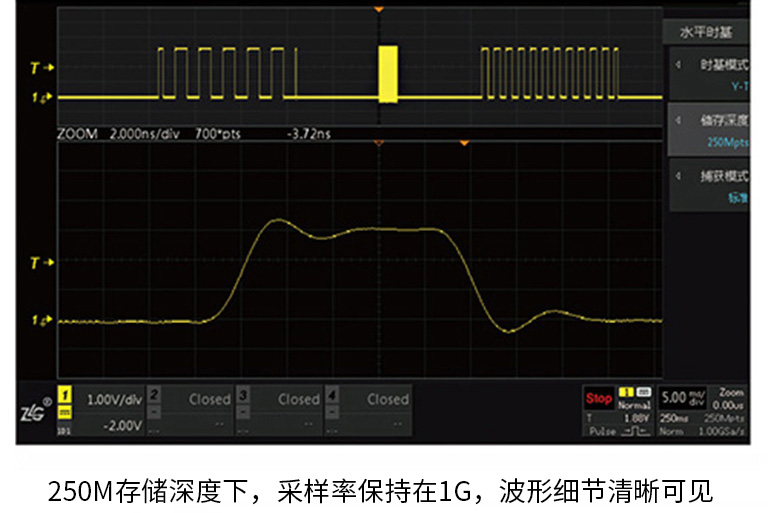 如果存儲深度能夠做到足夠大,就能保持較高的波形采樣率,則觀察到的波形會更加真實、細膩。反之,如果存儲深度只有1Mpts甚至更低,當要觀察時長較大的波形時,示波器就只能被迫降低采樣率。由于采樣點數(shù)不足,示波器顯示的波形也會嚴重失真,甚至產(chǎn)生波形混疊,誤導用戶測量分析。ZDS3000/2000B系列示波器創(chuàng)新性地采用DDR3存儲技術,配合大規(guī)模的FPGA器件,通過全硬件加速和多線程并行處理,存儲深度最高可達250M !在觀察長時間波形時也不丟失波形細節(jié)。