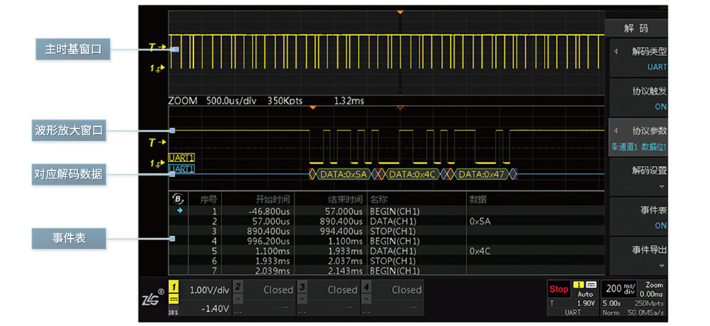 在調試協(xié)議信號的時候,不僅需要觀測協(xié)議波形,還要將波形解碼成對應的數(shù)據(jù)。但一直以來各大品牌示波器的協(xié)議解碼功能都要付費選配的,而且只有寥寥幾種。ZDS3000/2000B系列示波器基于客戶需求免費配備了41/29種協(xié)議解碼,CAN、LIN、IIC、SPI、UART、USB、PS/2、DALI、Wiegand、1-Wire、DS18B20、HDQ、 SD_SPI、SD_SD、IrDA、Manchester、DiffManche、Miller、DHT11、 SHT11、 NEC、RC5、RC6、FlexRay等,除此之外,ZDS3000/2000B系列示波器還免費配備了CAN FD協(xié)議解碼,再一次定義了200M示波器!