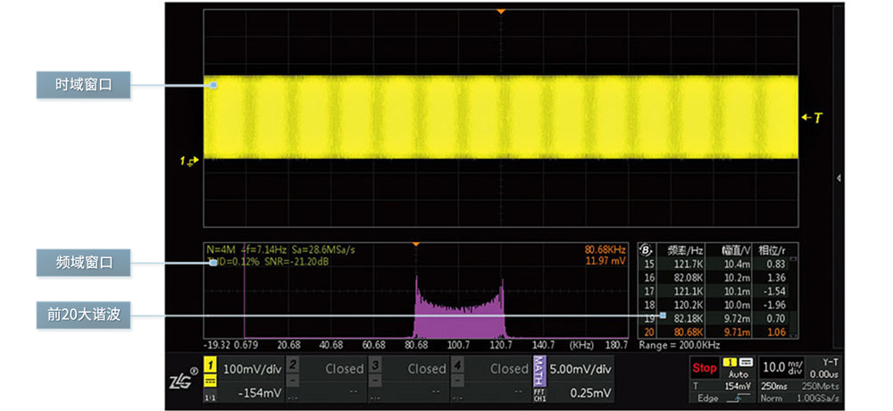 市面上多數(shù)2000系列示波器最大只支持8K樣本點的FFT分析,在1G采樣率的情況下,頻率分辨率僅有125KHz,多數(shù)情況都無法準確判斷信號頻譜分布。ZDS3000/2000B系列示波器拒絕單純的功能堆砌,內部采用了專業(yè)的處理芯片,突破技術壁壘,將FFT分析點數(shù)升級至4M樣本點,同樣在1G采樣率的情況下頻率分辨率能精確到250Hz,可以準確分析出電路中的干擾噪聲來源,大大提高了示波器FFT的實用價值。4Mpts FFT分析功能,不僅僅是在量上突破,而且還是在質上的飛躍。