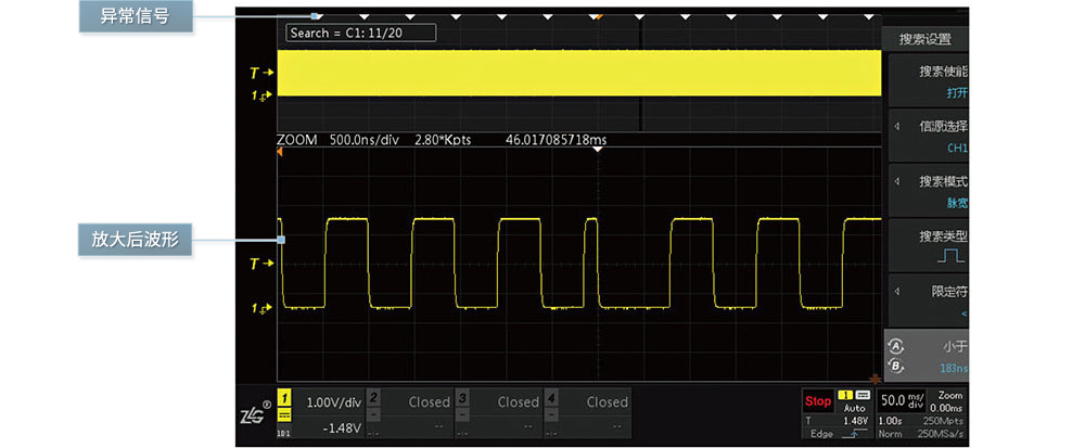 在調試信號波形時,我們需要明確信號是否出現(xiàn)了異常。如果出現(xiàn)了異常,那這些異常信號出現(xiàn)的頻率是多少,是不是周期性出現(xiàn)的呢?為了弄清楚這些問題,一般需要長時間記錄波形,然后基于這樣一個龐大的波形數(shù)據(jù)庫去定位異常波形出現(xiàn)的位置。ZDS3000/2000B系列示波器依托于海量存儲和硬件加速的優(yōu)勢,能夠從數(shù)十萬個波形中迅速定位出感興趣的信號,只要當前屏幕內出現(xiàn)了符合搜索條件的波形信號,系統(tǒng)都將自動地在對應位置做上標記,異常信號一覽無余。