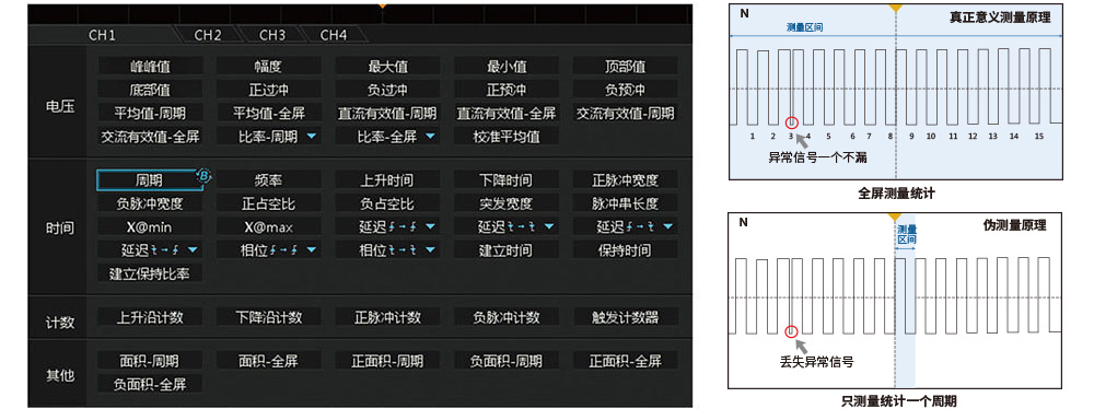 僅僅通過波形的直觀表現(xiàn)來分析波形遠遠不夠,只有將波形各項指標精確量化,才能看透波形異常的本質。然而受限于架構和芯片限制,絕大多數(shù)示波器的參數(shù)測量都是基于采樣結果進行抽點,無論屏幕中有多少個信號周期,都僅僅抽取每屏中的一個周期信號進行統(tǒng)計測量,這也直接導致了結果的嚴重失真。為了實現(xiàn)意義的參數(shù)測量統(tǒng)計,我們采用FPGA進行全硬件加速,通過對屏幕上每一個周期信號的測量,計算出每一項指標的最大值,最小值,平均值,標準差,實現(xiàn)了意義參數(shù)測量功能,并且多達50余種。