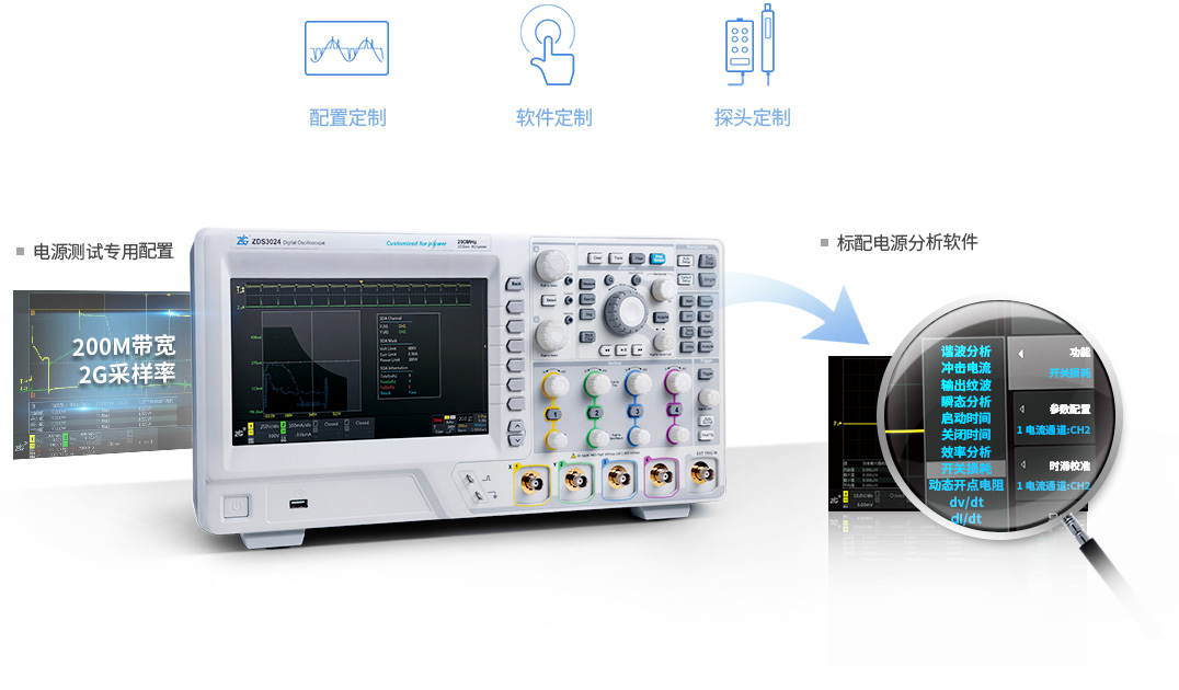 ZDS3024電源測(cè)試定制版示波器型號(hào)模擬帶寬通道采樣率存儲(chǔ)深度波形刷新率協(xié)議解碼種類FFT點(diǎn)數(shù)測(cè)量統(tǒng)計(jì)項(xiàng)FIR濾波器ZDS3024200MHz42G250Mpts>150Kwfms/s29種4M52種無為電源測(cè)試而生示波器作為通用測(cè)試儀器,產(chǎn)品設(shè)計(jì)必須平衡不同行業(yè)的需求。電源測(cè)試以模擬信號(hào)為主,很少測(cè)數(shù)字信號(hào)。為了解決通用示波器測(cè)量電源資源冗余的
