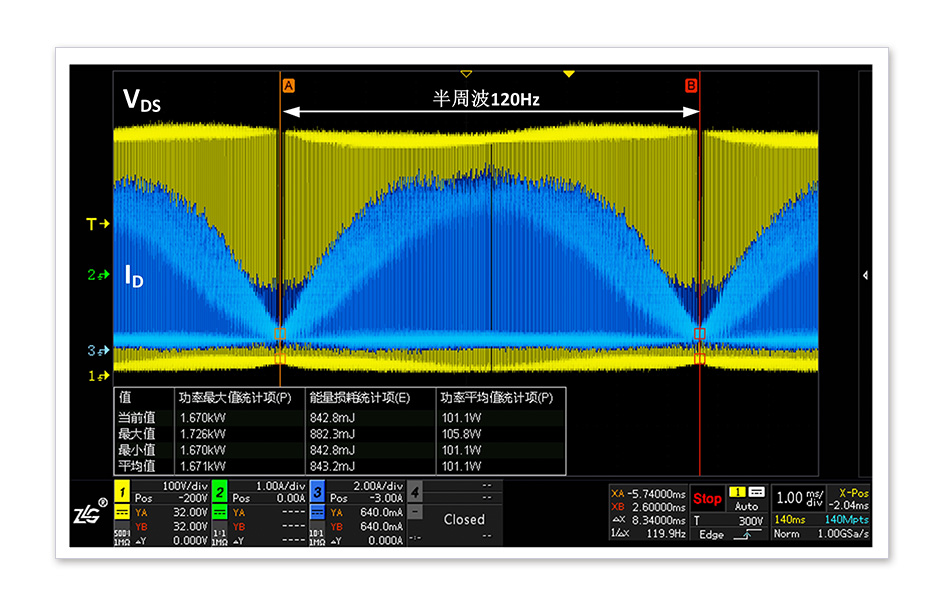 PFC MOS管開關(guān)損耗測(cè)試是電源調(diào)試中的難點(diǎn),由于不同周期的電壓和電流波形都不相同,功率損耗的準(zhǔn)確評(píng)估也更依賴長時(shí)間高采樣率的波形捕獲,因此存儲(chǔ)深度和功率損耗運(yùn)算原始點(diǎn)數(shù)成為開關(guān)損耗準(zhǔn)確與否的關(guān)鍵。ZDS3024示波器標(biāo)配250M存儲(chǔ)深度,并通過全硬件加速處理優(yōu)化,可精準(zhǔn)量化開關(guān)器件的功率損耗。
