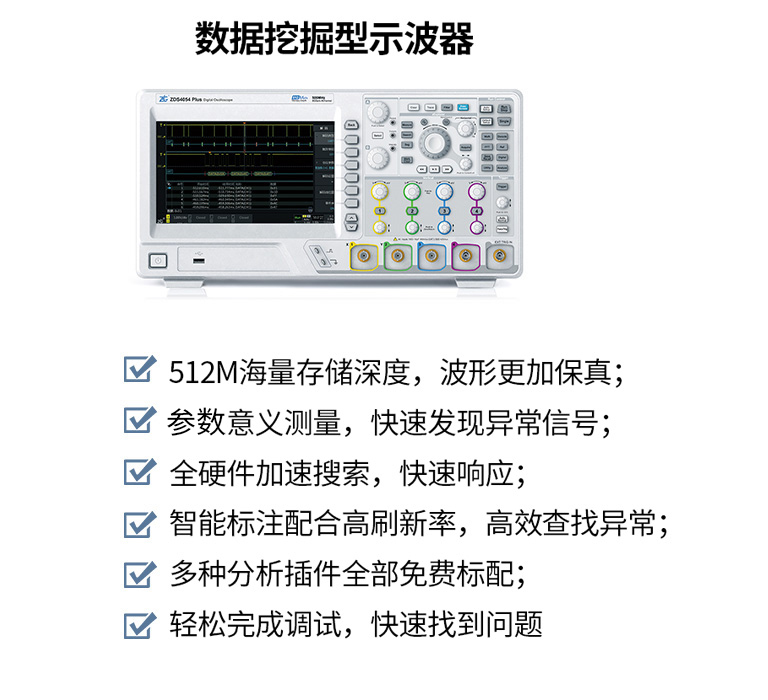 ZDS4000系列數(shù)據(jù)挖掘型示波器系列型號模擬帶寬通道采樣率存儲深度波形刷新率協(xié)議解碼種類FFT點數(shù)測量統(tǒng)計項FIR濾波器數(shù)據(jù)挖掘型ZDS4054 Plus500MHz44G512Mpts>1Mwfms/s41種4M54種有ZDS4034 Plus350MHz44G512Mpts>1Mwfms/s41種4M54種有ZDS4024 Plus200MHz44G512Mpts>1Mwfms/s41種4M54種有什么是數(shù)據(jù)挖掘型示波器?捕