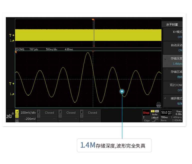 存儲深度等于采樣率乘以采樣時間,512M大存儲深度,長時間捕獲波形,依然不會出現(xiàn)波形失真。