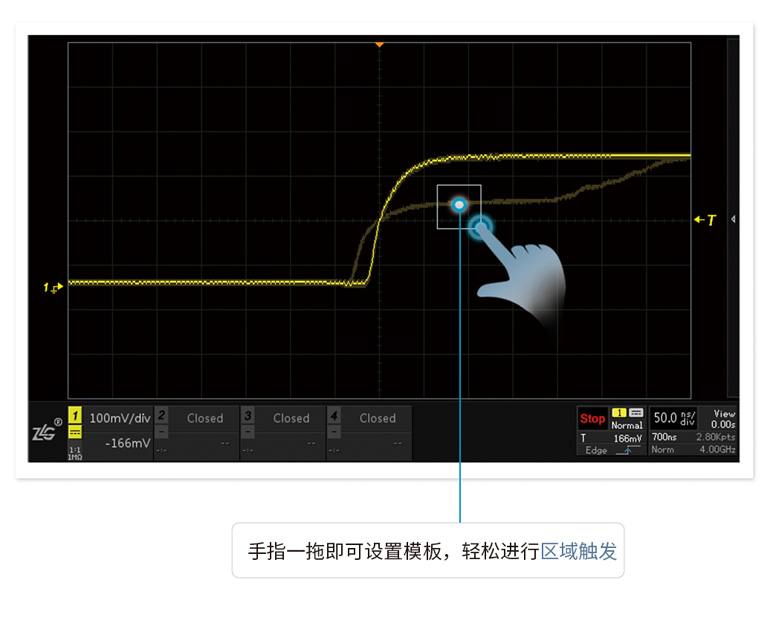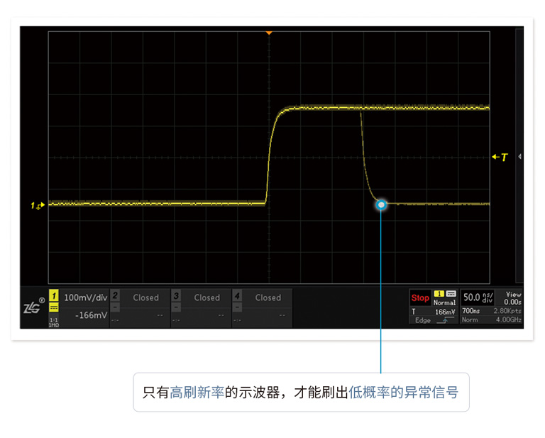 波形刷新率越高,死區(qū)時間就越短。ZDS4000系列示波器,標(biāo)配1M次波形刷新率,配合模板觸發(fā),讓您最大概率的發(fā)現(xiàn)并捕獲異常信號。