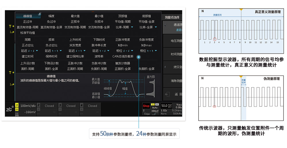 不同于傳統(tǒng)示波器只測一個周期,或通過抽樣減少數(shù)據(jù)量再測量的模式,ZDS4000系列示波器通過FPGA全硬件并行處理,基于原始采樣率和512Mpts全存儲深度,對每一幀波形每一周期進(jìn)行測量統(tǒng)計,僅需約1秒即可實現(xiàn)對512Mpts數(shù)據(jù)的“真正意義”參數(shù)測量,測試項目可達(dá)50余種,并且支持24種參數(shù)同時顯示。這與傳統(tǒng)意義示波器的測量有著本質(zhì)的區(qū)別,也是示波器測試手段與測試方法的突破。