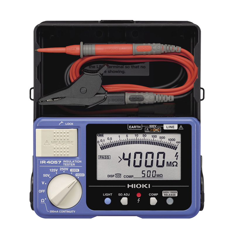 日置絕緣電阻表/兆歐表采用一體化設(shè)計。IR4057-50是一款有5檔量程,測試電壓 50V/100MΩ~1000V/4000MΩ的兆歐表,功能強大、響應(yīng)速度快,有助于縮短現(xiàn)場工作時間。