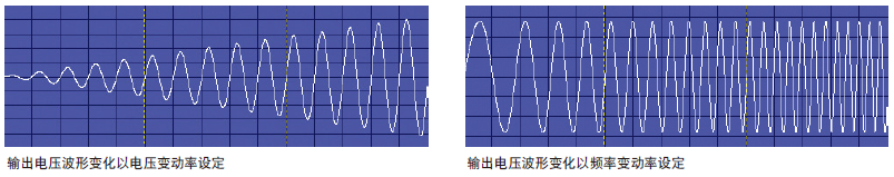 Chroma 61600系列可編程交流電源供應(yīng)器可以讓使用者設(shè)定電壓或頻率的輸出變動率,當輸出的電壓或頻率改變時,就會依照設(shè)定的變動率逐漸達到最終值。這可以幫助使用者驗證產(chǎn)品的操作范圍,例如可設(shè)定頻率由47Hz逐漸增加到63Hz,或電壓由90V逐漸增加到264V,取代只驗證輸入90V、115V、230V及264V幾個電壓點的方式。另外對待測物開機時,用電壓由0V逐漸上升的方式來減少輸入的浪涌電流,可應(yīng)用在馬達的啟動,或多個產(chǎn)品同時開機測試。