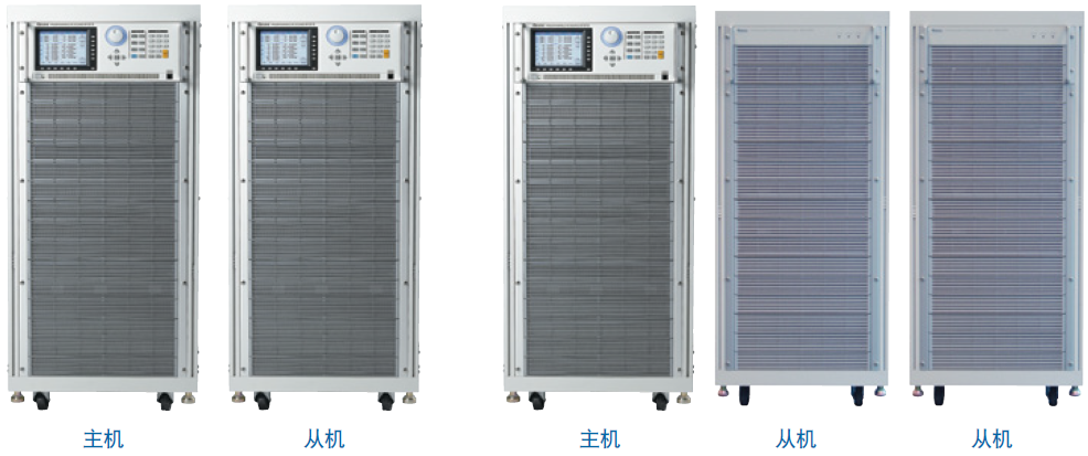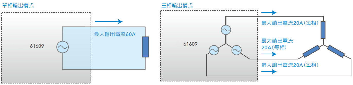 Model 61601/61602/61603/61604/61605機種則可以使用三臺單機,在三相模式的同步機制下串聯(lián)成三相電輸出使用。