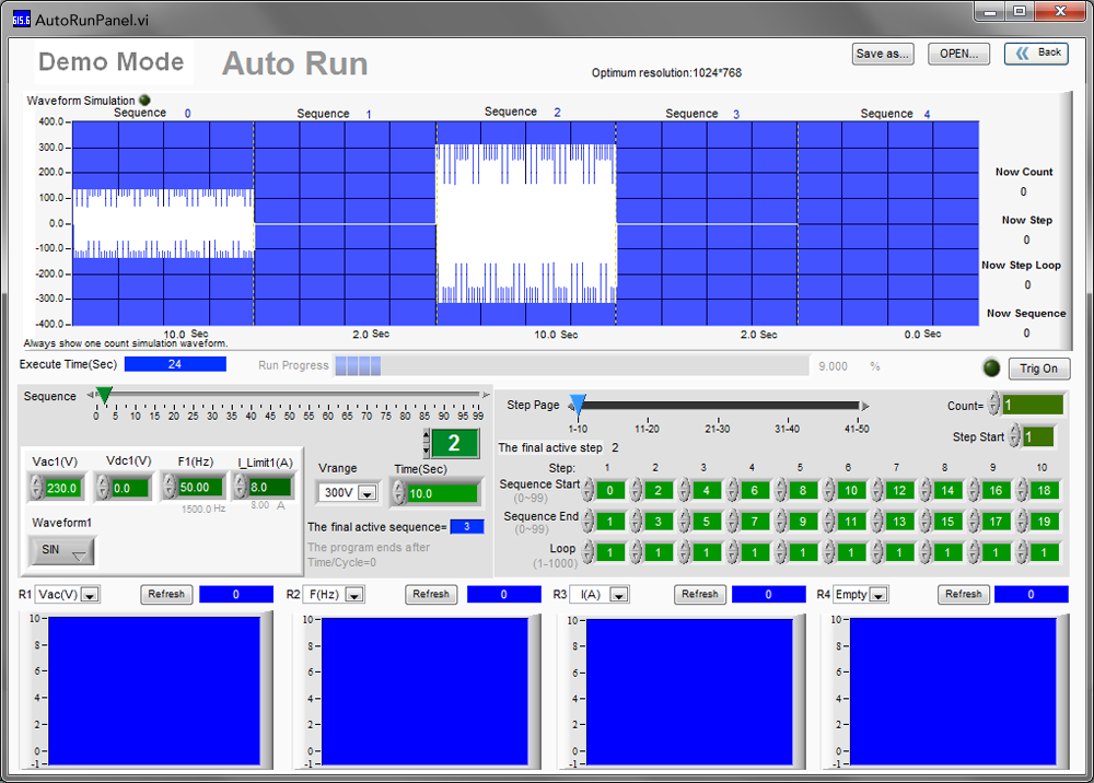 此操作介面提供Auto Run模式,此功能具備100組電壓/頻率變化于多回圈測試(時間以秒為單位),并且可調(diào)整Loop及Count等內(nèi)外回圈設(shè)定予使用者進行反覆性長時間測試。