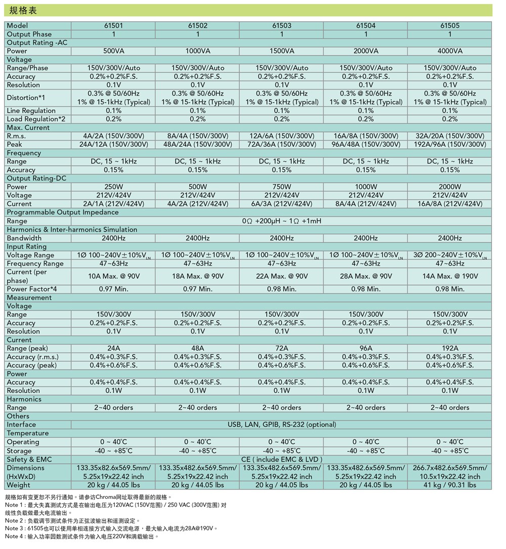 型號規(guī)格系列機種61601/ 61602/ 61603/ 61604/ 6160561607/ 61608/ 6160961611/ 61612功率規(guī)格500VA/ 1kVA/ 1.5kVA/ 2kVA/ 4kVA3kVA/ 4.5kVA/ 6kVA12kVA/ 18kVA輸出模式單相單相 或 三相單相 或 三相電壓規(guī)格0~150V/ 0~300V/ Auto0~175V/ 0~350V/ Auto0~150V/ 0~300V/ Auto頻率DC. 15Hz~1kHzDC. 15Hz~2kHzDC. 15Hz~1.5kHz并