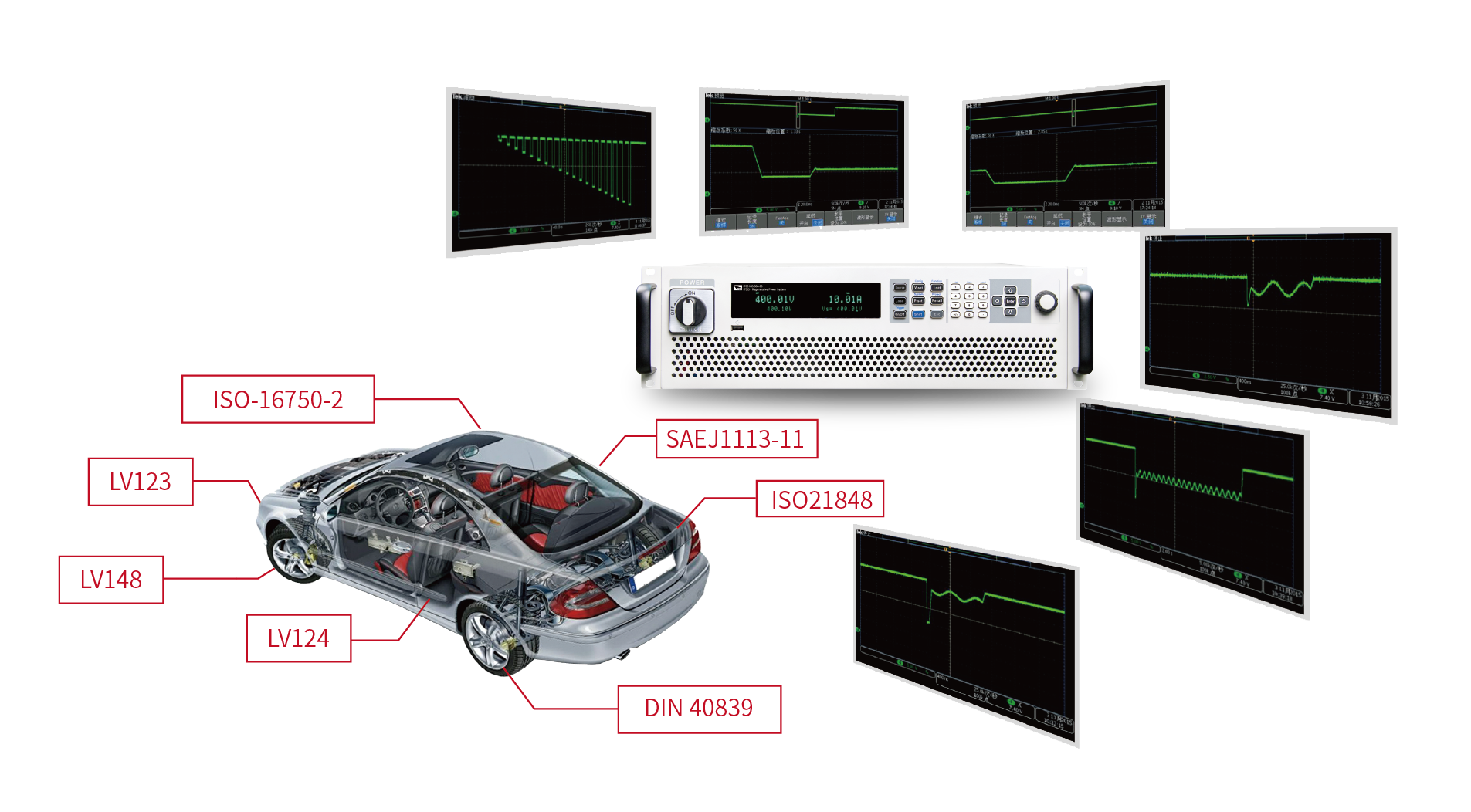 汽車電子設(shè)備在汽車啟動和運行過程中可能經(jīng)常遇到電源瞬變的干擾, 為確保被測件能夠經(jīng)受得住這些實際瞬變,用戶需要在測試過程中仿真最壞情況功率瞬變條件。根據(jù)行業(yè)的相關(guān)標(biāo)準(zhǔn)IT6000B系列內(nèi)置了LV123、LV148、DIN40839、ISO-16750-2、SAEJ1113-11、LV124 和ISO21848 標(biāo)準(zhǔn)汽車功率網(wǎng)用電壓曲線,用戶可直接調(diào)取出汽車啟動瞬間電壓跌落及多種汽車電子測試脈沖波形對相關(guān)的汽車電子產(chǎn)品進(jìn)行性能測試,具有12V、24V 和48V 電壓等級可供選擇。