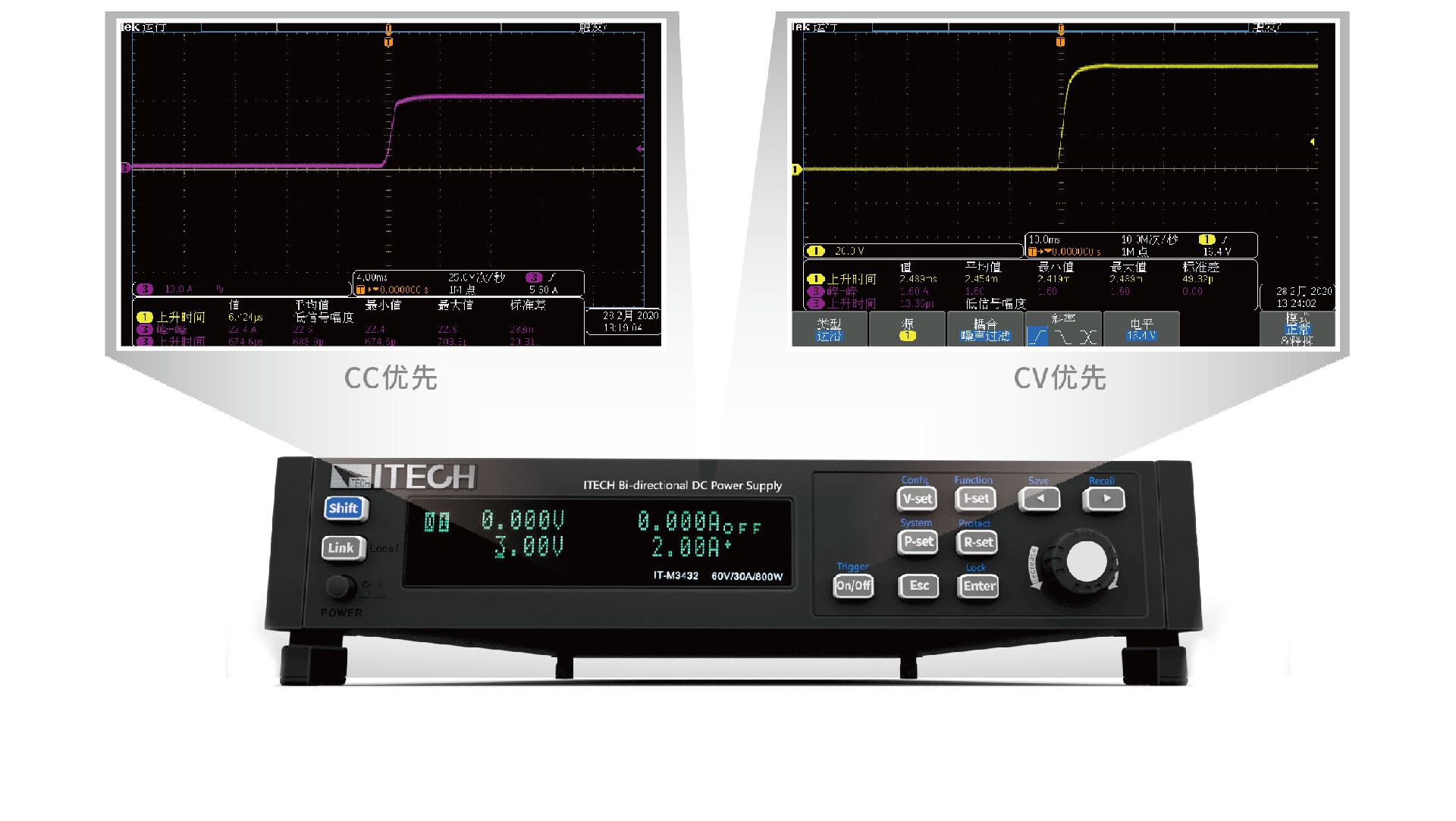 IT-M3400延續(xù)了ITECH的CC/CV優(yōu)先權概念,幫助用戶解決了長期測試中存在的多種嚴苛問題,使需求的電源高速或者無過沖的應用,變得更加靈活。針對需要電壓高速的測試場景,用戶可以選擇CV優(yōu)先模式,獲取較快的電壓爬升速度;也可以選擇CC優(yōu)先模式,輸出電流無過沖,用來測試恒流工作特性的待測物。適用于諸如激光器、集成電路、充放電、和汽車電子的電源瞬變仿真和表征等多種測試應用。