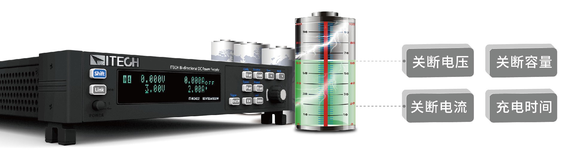 IT-M3400具有電池充電功能,可對電池進行充電測試。用戶通過面板就可自行設置電池四種測試關斷條件:關斷電壓、關斷電流、關斷容量和充電時間。當四者中任意一種條件滿足時,即會自動中斷測試。測試過程中可觀測電池的電壓、充電時間和已充電容量。