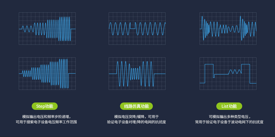 高性能可編程交流電源集成List、Step、線路仿真等功能,可直接設(shè)置電氣參數(shù)(如電壓、相位、頻率、時(shí)間等),精準(zhǔn)模擬輸出突升突降、中斷等多種類型電壓,為電子產(chǎn)品性能和功能的驗(yàn)證提供多種類型的電源輸入。對(duì)于復(fù)雜不易編輯的電壓,可將波形文件導(dǎo)入交流電源,交流電源能完整還原輸出,尤其適合于戶外光伏逆變器、通訊UPS等產(chǎn)品驗(yàn)證測(cè)試。