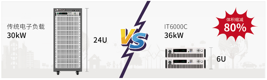 普通的能耗性電子負(fù)載不僅耗能耗電,本身的體積和重量也非常大。30kW的能耗型負(fù)載體積至少要24U,不但搬運(yùn)困難,成本較高。IT8000系列能量回饋式直流電子負(fù)載采用高功率密度設(shè)計(jì),3U體積內(nèi)可提供高達(dá)18kW的功率吸收。同樣的輸出功率,體積減少了80%。